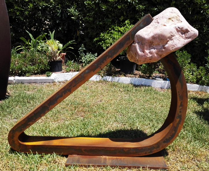En otras también he utilizado la combinación de piedra y hierro, para de este modo, mostrar la interacción entre el ser humano y la naturaleza, en las cuales las piedras pueden ser objeto de culto, por su belleza, caso de Acento, en la cual un trozo de pizarra es colocada como en un pedestal de hierro que la sujeta y eleva, o en Equilibrio natural, en la cual un trozo de granito, parece crecer y elevarse majestuoso.